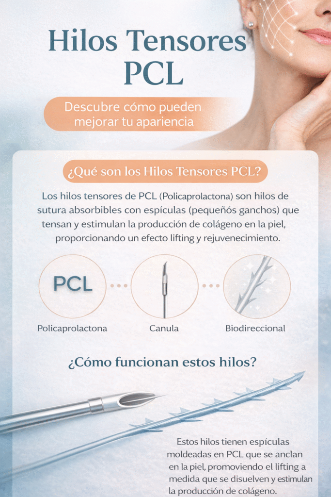 Los hilos tensores de PCL, o hilos de poli-caprolactona, son una opción avanzada en la categoría de hilos tensores. Estos hilos están compuestos por un polímero sintético que se caracteriza por su durabilidad y capacidad de estimular la producción de colágeno en la piel.